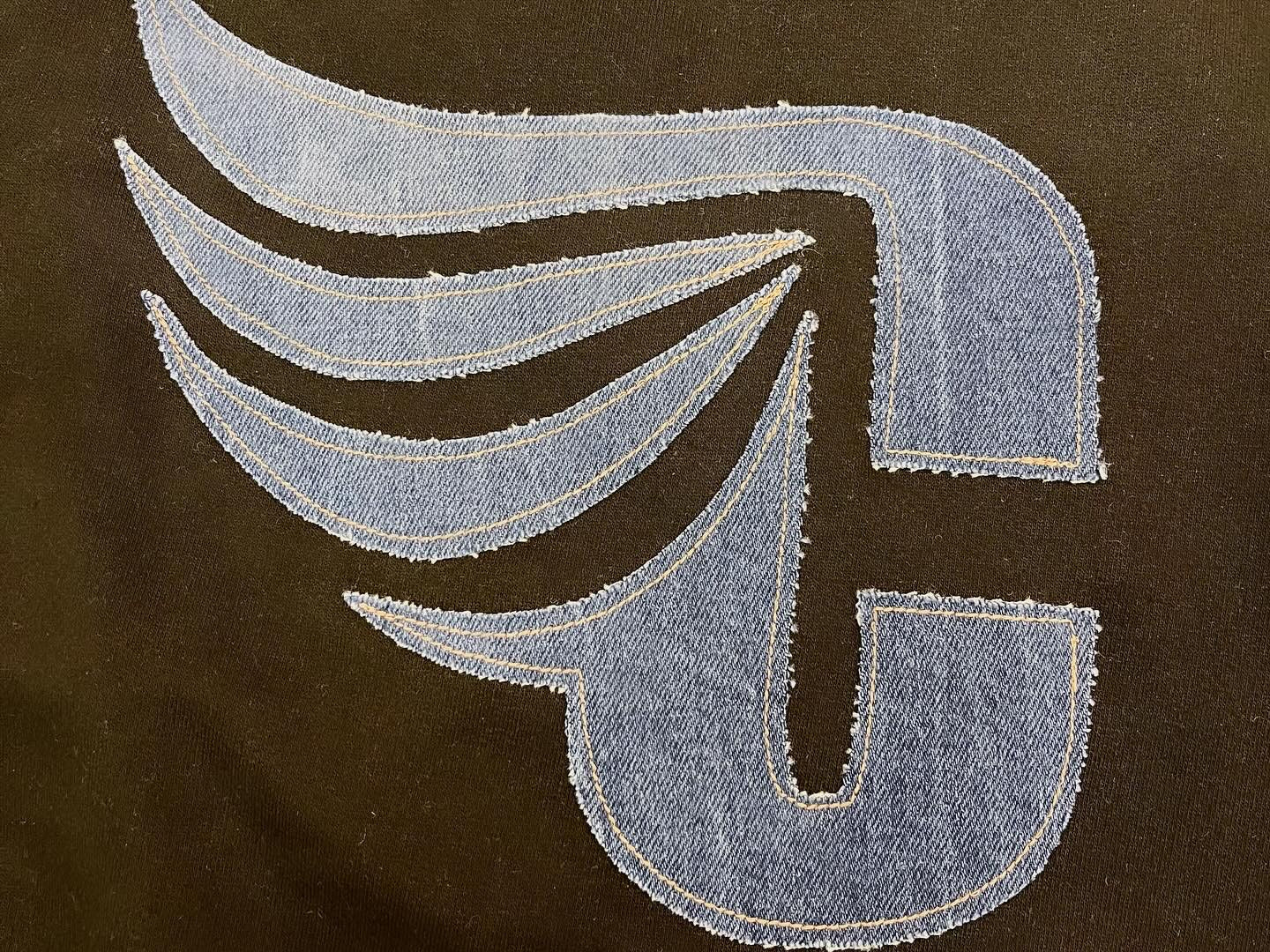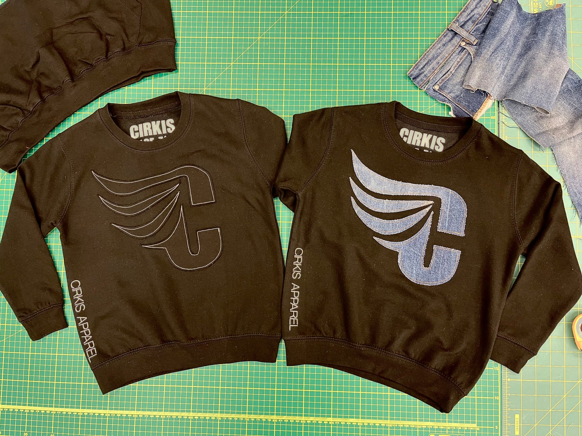 We made these by black jumpers by customising each one with off cuts of jeans and repurposing the pieces by creating our winged C logo and stitching the edge in tan thread, to great effect.